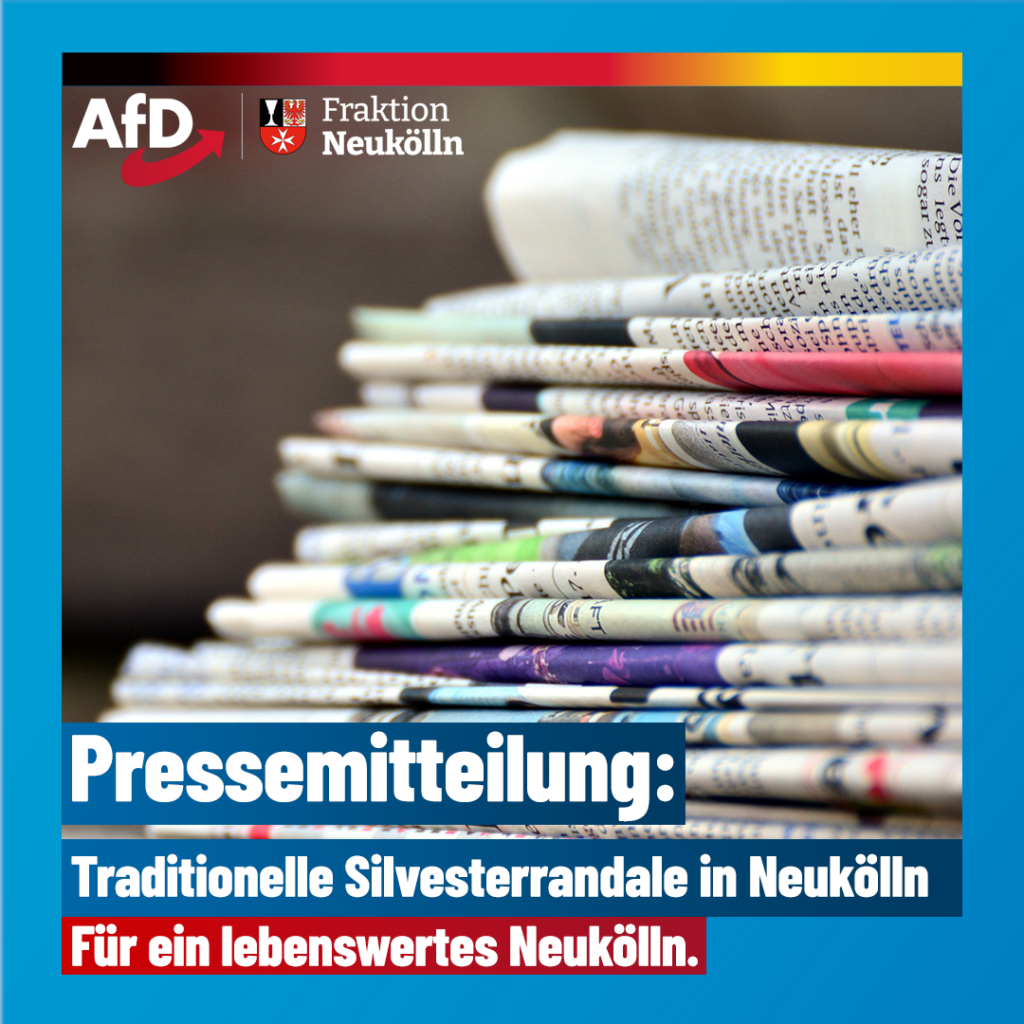 - Ausnahmezustand bei „Traditioneller Silvesterrandale“ in Neuköllnvon AfD-Fraktion NeuköllnPressemitteilung der AfD-Fraktion Neukölln vom 01.01.2026, Julian Potthast zu den „traditionellen Silvesterrandalen“ in Neukölln: Die Befürchtungen hinsichtlich Brutalität gegen Feuerwehr, Polizei und Rettungskräfte haben sich leider bestätigt. Obwohl sich die Berliner Feuerwehr mit rund 2000 Einsatzkräften für den Jahreswechsel wappnete, sieht die Bilanz wie im Vorjahr erschreckend aus: Wieder haben Chaoten gezielt schwere pyrotechnische Geschosse auf Feuerwehr und Rettungswagen abgefeuert, so besonders drastisch am Hermannplatz.