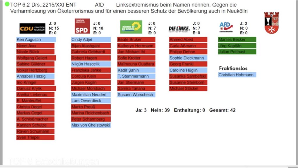 Die Bezirksverordnetenversammlung Neukölln verurteilt den jüngsten linksextremistisch motivierten Brandanschlag auf die Stromversorgung Berlins ausdrücklich. Der Anschlag auf den Berliner Südwesten, der vermeintlich Reiche und Privilegierte treffen sollte, reiht sich ein in eine Kaskade von Vorfällen in Berlin und Brandenburg, bei denen von grünen und linken Ideologien beeinflusste Terroristen den Verlust von Menschenleben billigend in Kauf nehmen, um ihre verqueren Ideen von „Ökozid“, Antikapitalismus und Fortschrittsfeindlichkeit auszuleben. Erst im September vergangenen Jahres hatte es einen ähnlichen Anschlag auf die Stromversorgung im Neuköllner Nachbarbezirk Treptow-Köpenick gegeben, der sich auch auf Teile Neuköllns auswirkte.