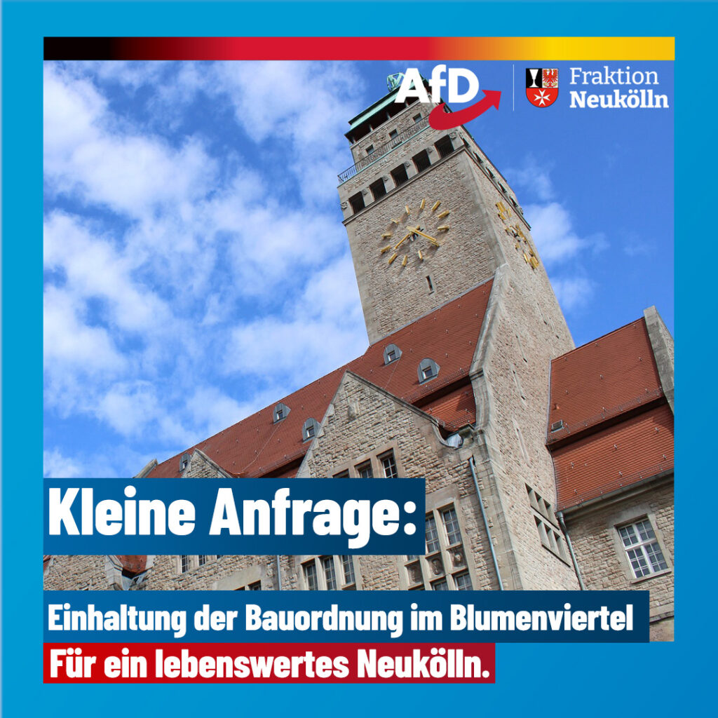 - Schwarzer Samstag für Neukölln: Missbilligung der Israel-feindlichen und antisemitischen Veranstaltung der Neuköllner LinkeEntschließung (abgelehnt) der AfD-Fraktion Neukölln vom 10. September 2025: Schwarzer Samstag für Neukölln – Missbilligung der Israel-feindlichen und antisemitischen Veranstaltung der Neuköllner Linke